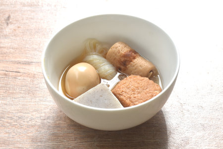 boiled Oden or fish ball and egg in clear soup Japanese food on bowl