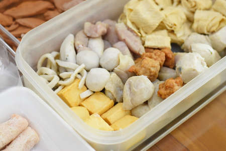 Thai style food, pork and fish ball in take away box