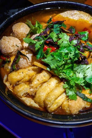 Pot of hot pot with dumplings on the table in the kitchen