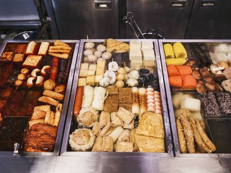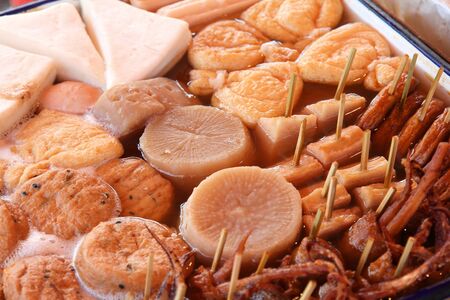 Japanese cuisine - oden food in soy broth. Typical winter food in Japan with dumplings, tofu and daikon. Tokyo street food.