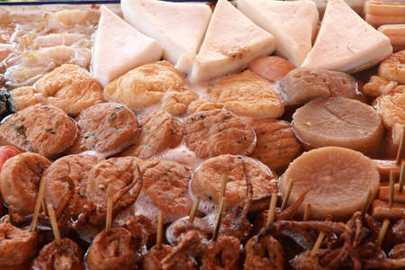 Oden(Japanese hotchpotch) cuisine of daikon radish, konnyaku, and fish cakes in soy-flavoured dashi broth at a street stall