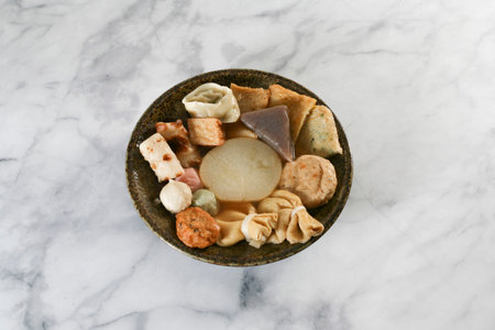Oden Japanese Hotchpotch, Various Fish Ball Dumpling, Radish, Egg, Taro, and Carrot Stewed in a Thin Clear Soy Soup