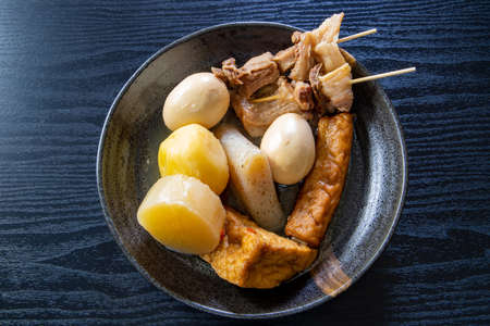 Oden - a Japanese winter food served in a bowl on wooden table. Close up shot
