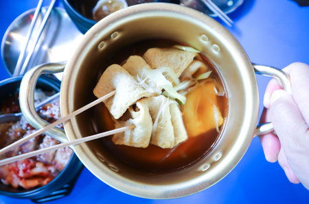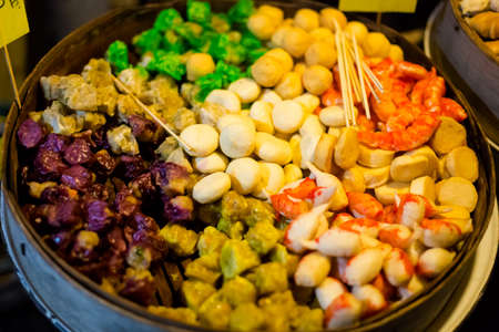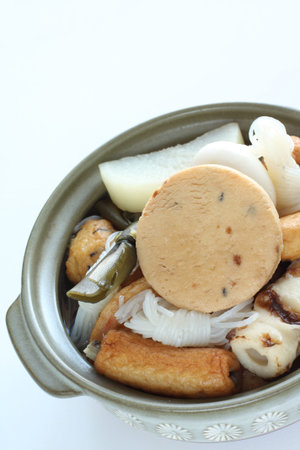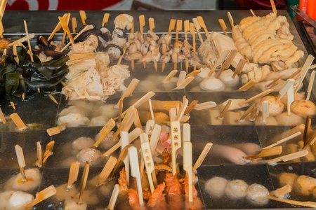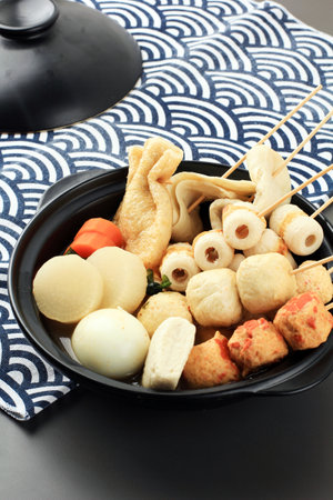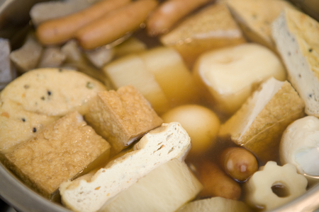 Japanese Oden. Japanese Vegetables, Fish Dumplings Skewers, and Various other Food Stewed in Thin Soy Soup