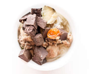 Vietnamese rice noodles or Pho with slice sausage and chop pork in soup on bowl