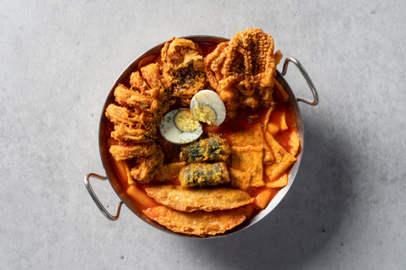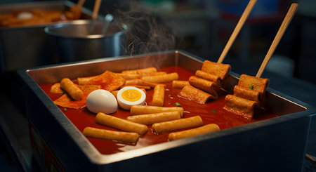 Typical Korean street food on a walking street of Seoul. Spicy fast food simply found at local Korean martket, Soul Korea