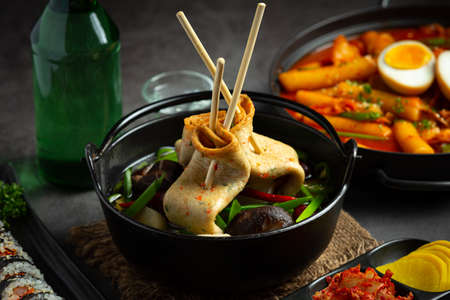 Korean street food. Odeng or Stick of fish cakes. They are skewered on a stick and left in a delicious broth.