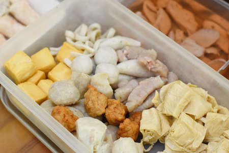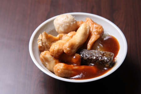 Taiwan cuisine - oden food in soy broth. Typical winter food with meatballs, tofu and daikon.