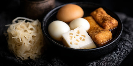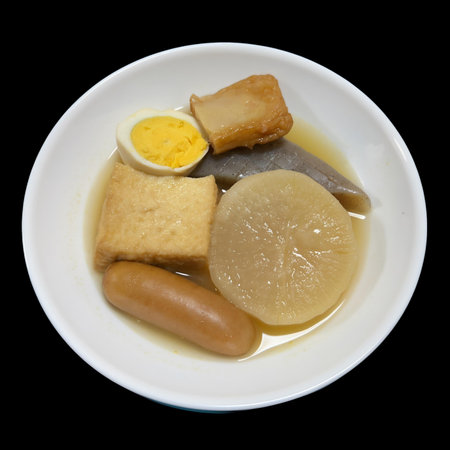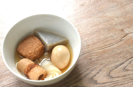 boiled Oden or fish ball and egg in clear soup Japanese food on bowl