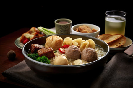 bowl of tom yam soup with ingredients such as fish balls and shrimp, created with generative ai