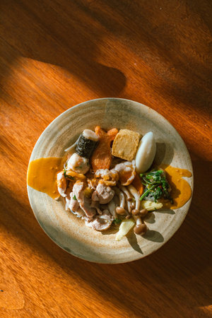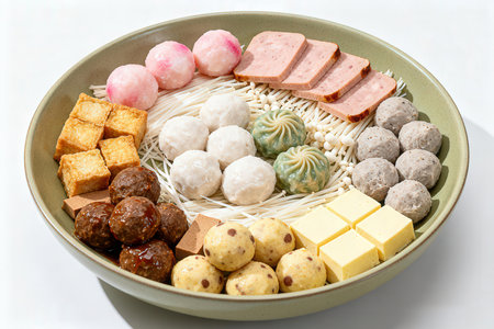Indulge in a steaming bowl of Japanese nabe hot pot filled with fresh ingredients like fish, vegetables, eggs, and tofu, perfect for cozy gatherings.