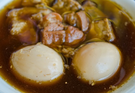 boiled egg with chicken drumstick with fried tofu in herb brown soup on bowl
