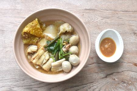 boiled dory fish and fishball with bean sprout topping crispy dumpling in soup on bowl dipping spicy chili soy paste sauce