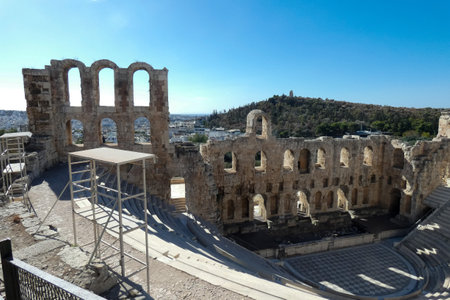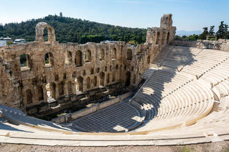 Athens, Attica / Greece - October 21, 2018: Facade of the Odeon of Herodes Atticus (or Herodeon). It is a stone theater structure located on the southwest slope of the Acropolis. Panoramic view