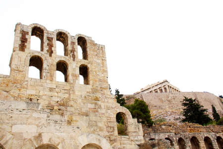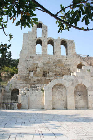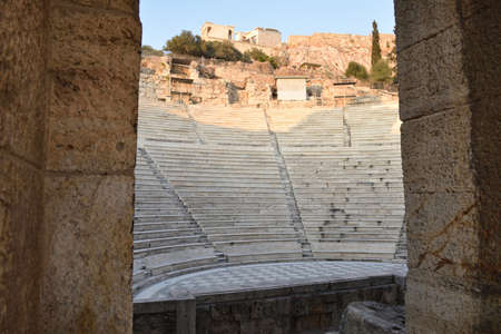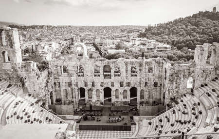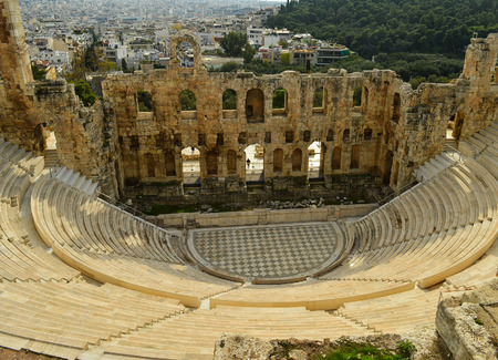 ncient theatre of Herodes Atticus is a small building of ancient Greece used for public performances of music and poetry, below on the Acropolis and in background dwelling of metropolis Athens