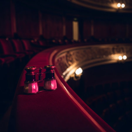 Elegant architectural interior emphasizing the sharp contrast between the sweeping red velvet seating, rich golden plasterwork, and the glossy brown wood flooring under dramatic overhead light.