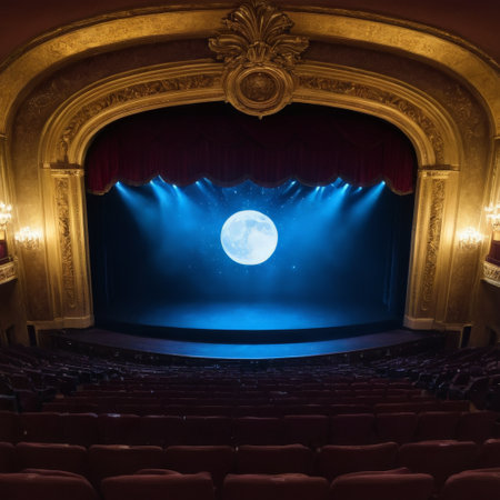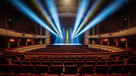Empty grand theater with vibrant stage lighting illuminating the performance area and red seats