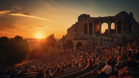 Golden hue bathes Greek theater stage at sunset silhouetting audience