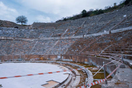 Selcuk, Izmir, Turkey - 03.09.2021: ancient Theater steps and protective ropes in Ephesus ruins, historical ancient Roman archaeological sites in eastern Mediterranean Ionia region