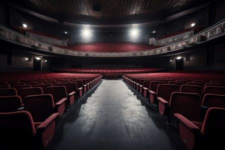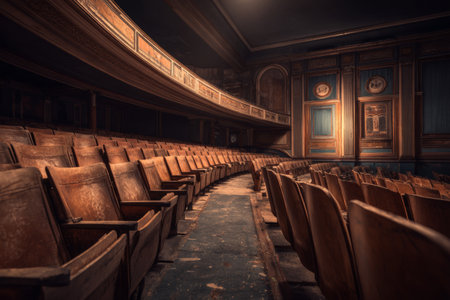 An auditorium with rows of chairs perfectly aligned, creating a tidy and orderly space, A Victorian era theatre with phantom attendees, AI Generated
