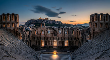The historic Odeon of Herodes Atticus in Athens, Greece, illuminated at twilight with the Acropolis visible in the background.