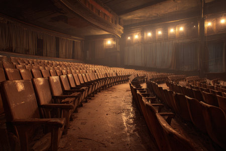 An abandoned theater hall with empty rows of worn seats. Dust settles on the ground. Dim lights highlight the fading curtains and walls. A sense of history and nostalgia fills the space.