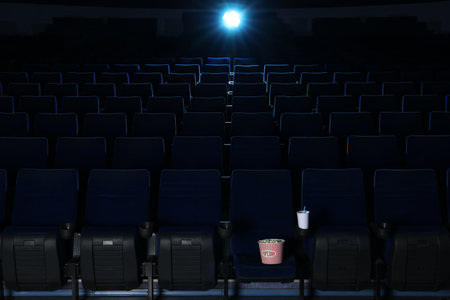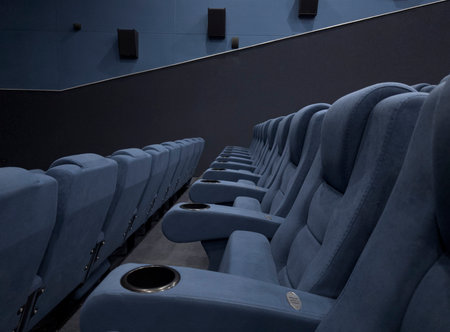 Close-up of vacant cinema seats with a dark screen in the distance, clean setting
