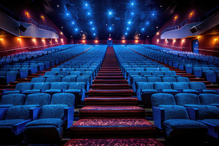 Elegant Theater Auditorium with Rows of Plush Seats and Stunning Azure Lighting Design Throughout