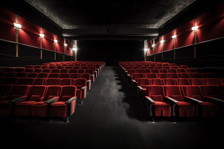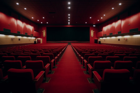 Empty cinema interior with red upholstered seats aligned towards the screen theater lit with warm, ambient light