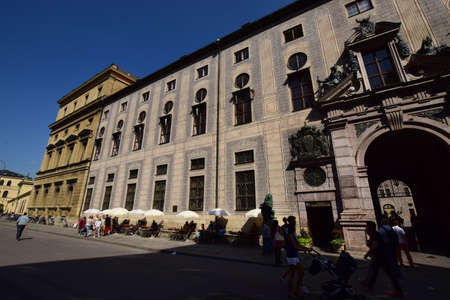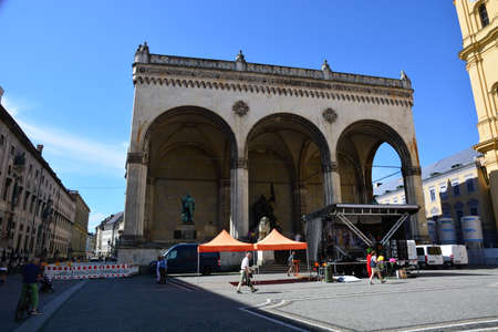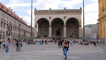 Munich, Germany - May 29, 2016: People walking in front of Field marshall's hall (Feldherrnhalle), a monumental loggia on the Odeonsplatz in Munich, Bavaria, Germany.