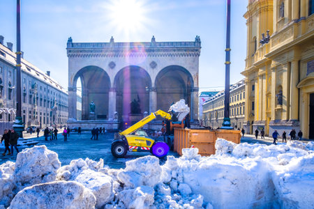 Munich, Germany - February 5: snow removal with excavator on February 5, 2019 at the odeonsplatz in munich, germany
