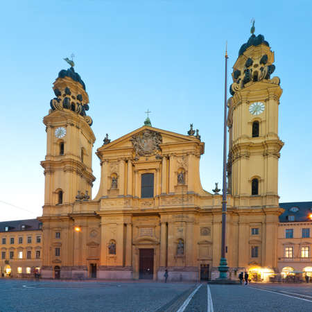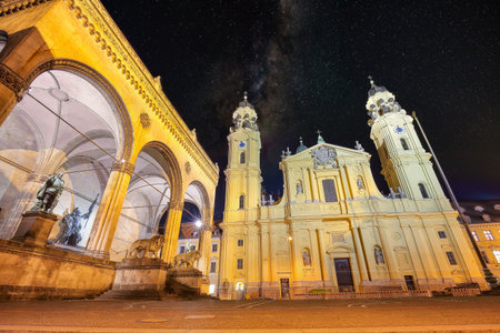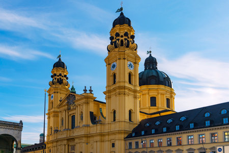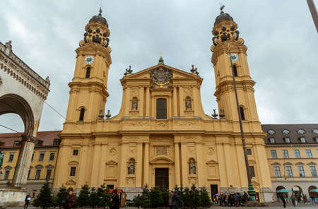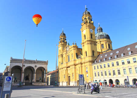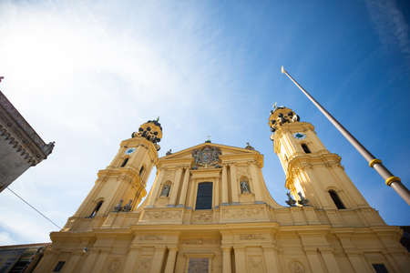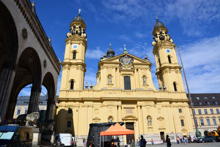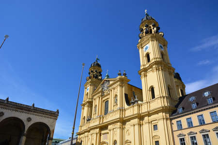 Amazing cityscape and view on Theatine Church of St. Kajetan or Theatinerkirche and Feldherrnhalle in Munich. Location: Munich, Bavaria, Germany, Europe.