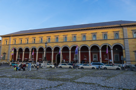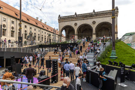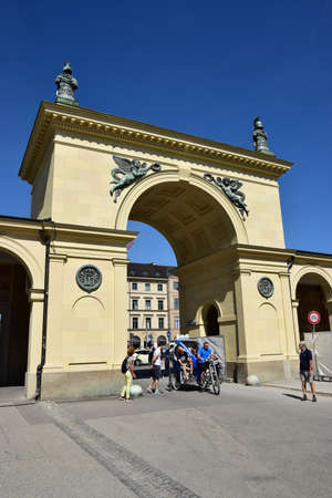 Munich, Germany - June 29, 2018: Visitors and tourists in front of the field Marshals Hall on the Odeon Square on June 29, 2018 in Munich.