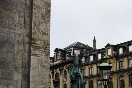 Copenhagen cityscape showing buildings, a statue and a street lamp