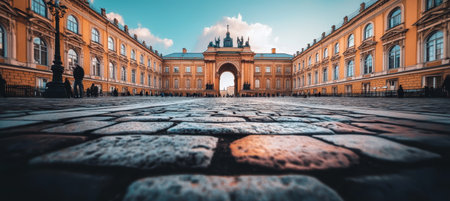 Cobblestone Square Leading Towards Archway of Historic Building, Saint Petersburg, Russia