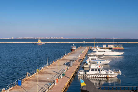 Port of Odessa, Ukraine, March, 06, 2020. Views of container and cargo berths with sea vessels, tugs and yachts in the port.