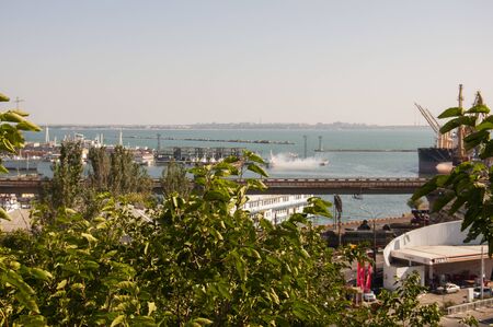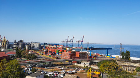 Odessa, Ukraine 06.06.2020. View from the sea of the cargo port and container terminal in Odessa, Ukraine