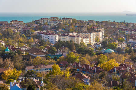 view of Black Sea and lighthouse in Yalta city in summer day. Crimea