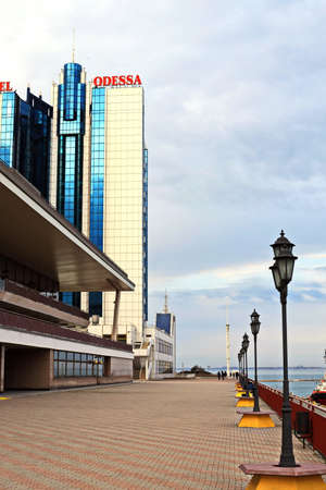Black sea, beachs and modern seafront building at sunset. Odessa, Ukraine