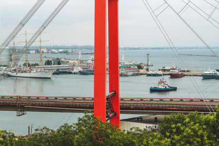 Ukraine, Odessa, July 4, 2019. Ships and container ships in the port. Logistics, transportation, unloading of container ships, freight transport, container cargo ships, sea transport.