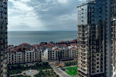 Beautiful sea views and apartment buildings. High-rise buildings located on coast on background of sea