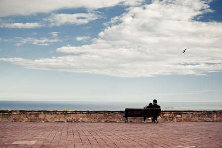 Couple is sitting on the bench and looking at the horizon, with sea and sky at the background