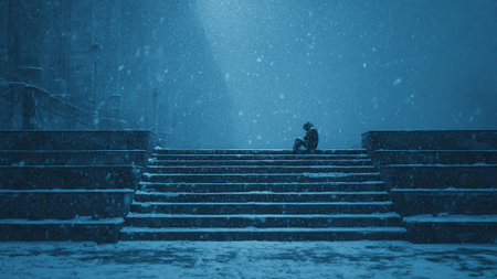 A lonely person sitting in the rain, photorealistic wet clothes and hair, moody blue lighting, reflection on wet pavement, Ai created image