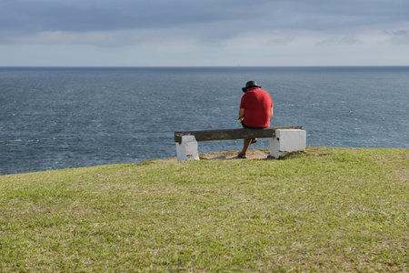 Pensioner sitting on a bench and looking at ocean. old elderly man sits alone on a bench on a rock and looks into the distance. concept of loneliness or relaxation.