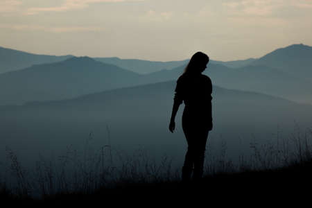 girl tourist high in the mountains sunset sun fog tops of the carpathians
