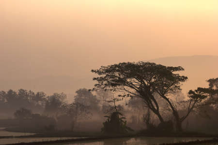 Morning mist over the rice fields, Thailand. Processed in vintage filtered style.
