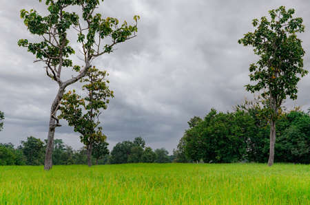 Landscape green rice field and cloudy sky. Rice farm with tropical tree. Agriculture land plot for sale. Farm land. Rice plantation. Organic rice farm. Country view. Carbon credit concept. Rural area.