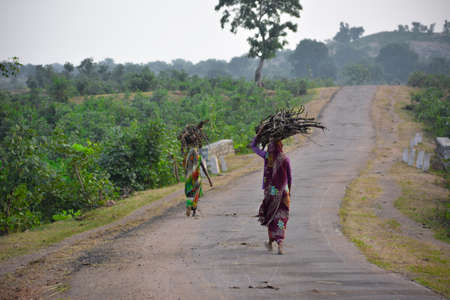 indian women carrying wood branchs on their heads. Indian girl carrying wood on head at the road, An Indian rural scene.