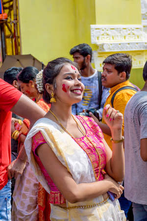 Indian Girl in Traditional Saree with Holi on the face