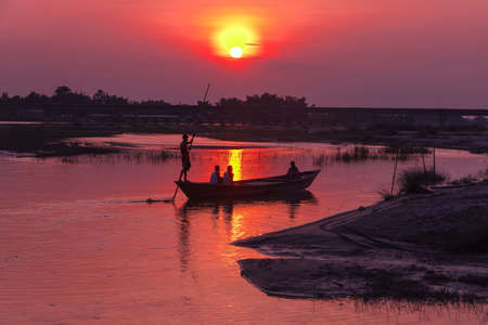 Fishermen on fishing boat fishing in the river